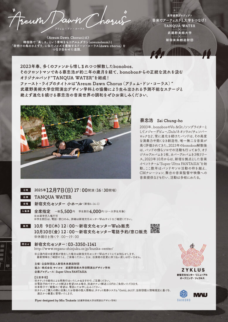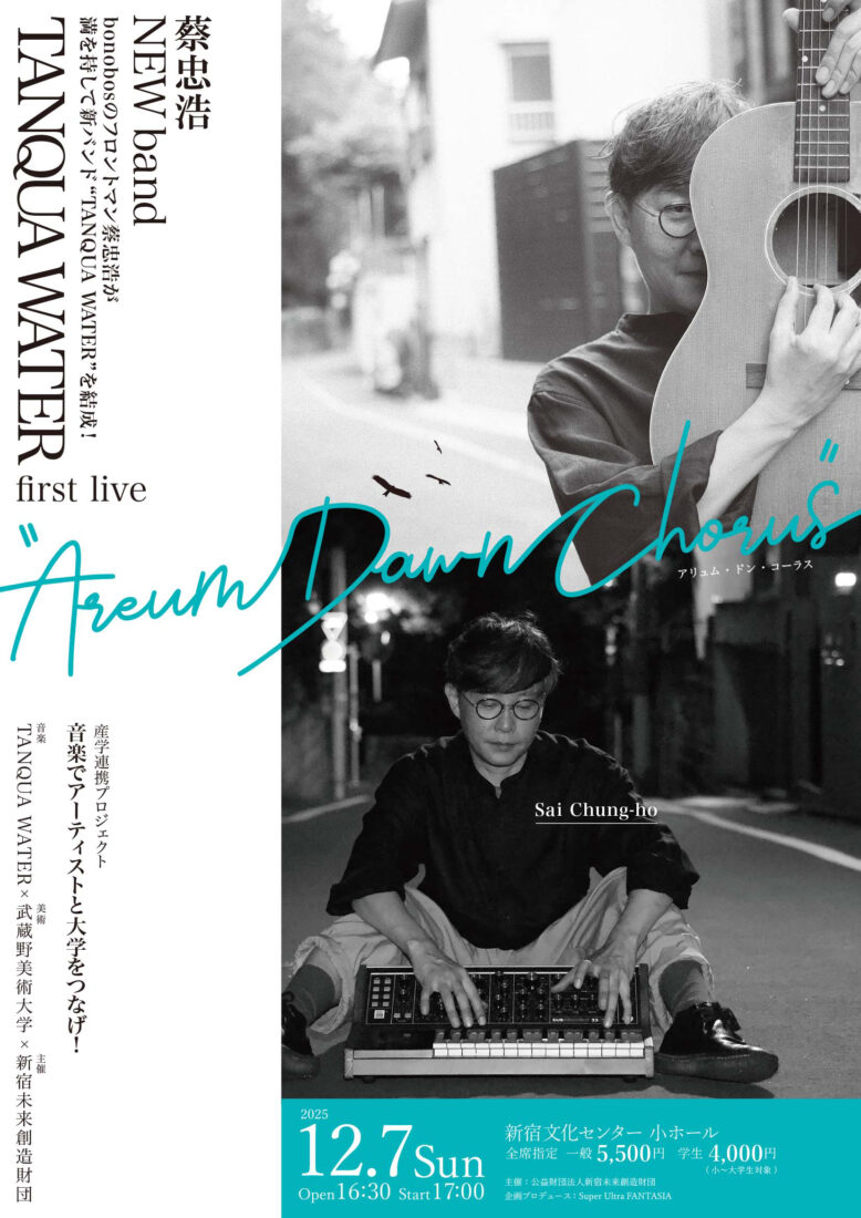 2023年春、多くのファンから惜しまれつつ解散したbonobos。そのフロントマンである蔡忠浩が約二年の歳月を経て、bonobosからの正統な流れを汲むオリジナルバンド“TANQUA WATER”を結成!ファースト・ライブのタイトルは“Areum Dawn Chorus(アリュム・ドン・コーラス)”武蔵野美術大学空間演出デザイン学科との協働により生み出される予測不能なステージと絶えず進化を続ける蔡忠浩の音楽世界の調和をぜひお楽しみください。